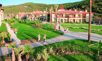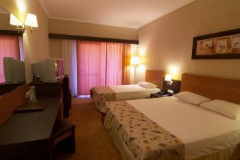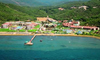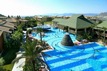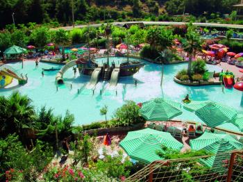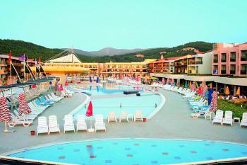Большой отель с красивой зеленой территорией, море возле берега мелкое. Хорошее питание. Отель рассчитан на размещение семейных пар с детьми, поэтому во всех стандартных номерах большая кровать. Для проживающих в отеле вход в аквапарк бесплатный, еда и напитки – платные.